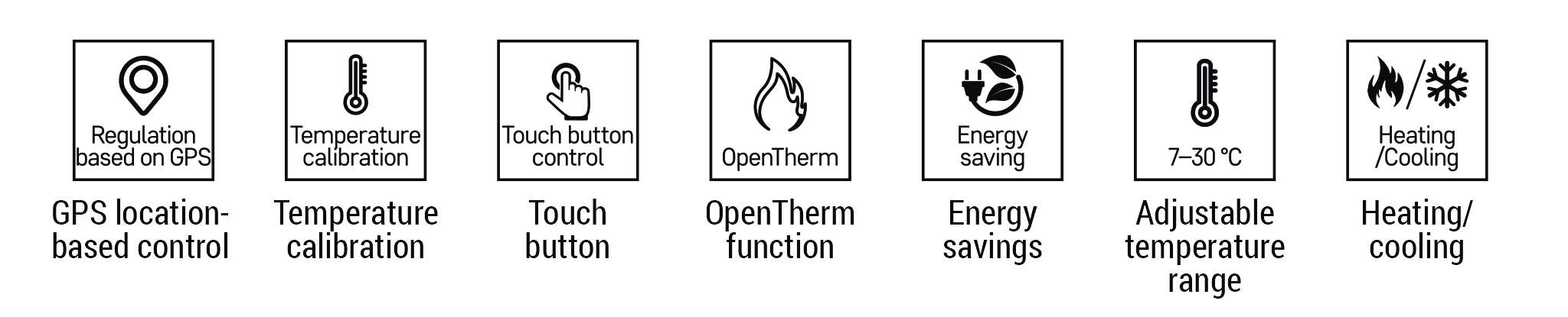 | reguliavimo tipas | programuojamas elektroninis kambario termostatas, galimybė reguliuoti mobiliuoju telefonu (iOS, Android) |