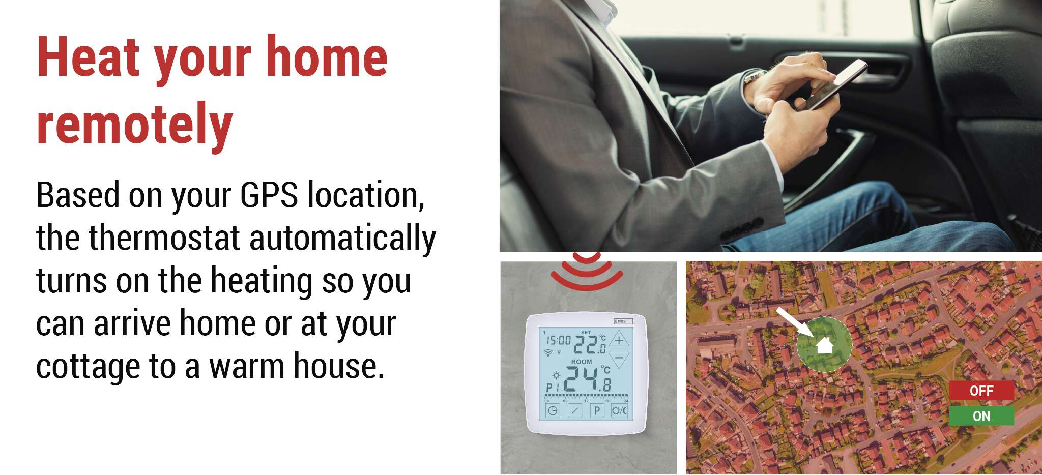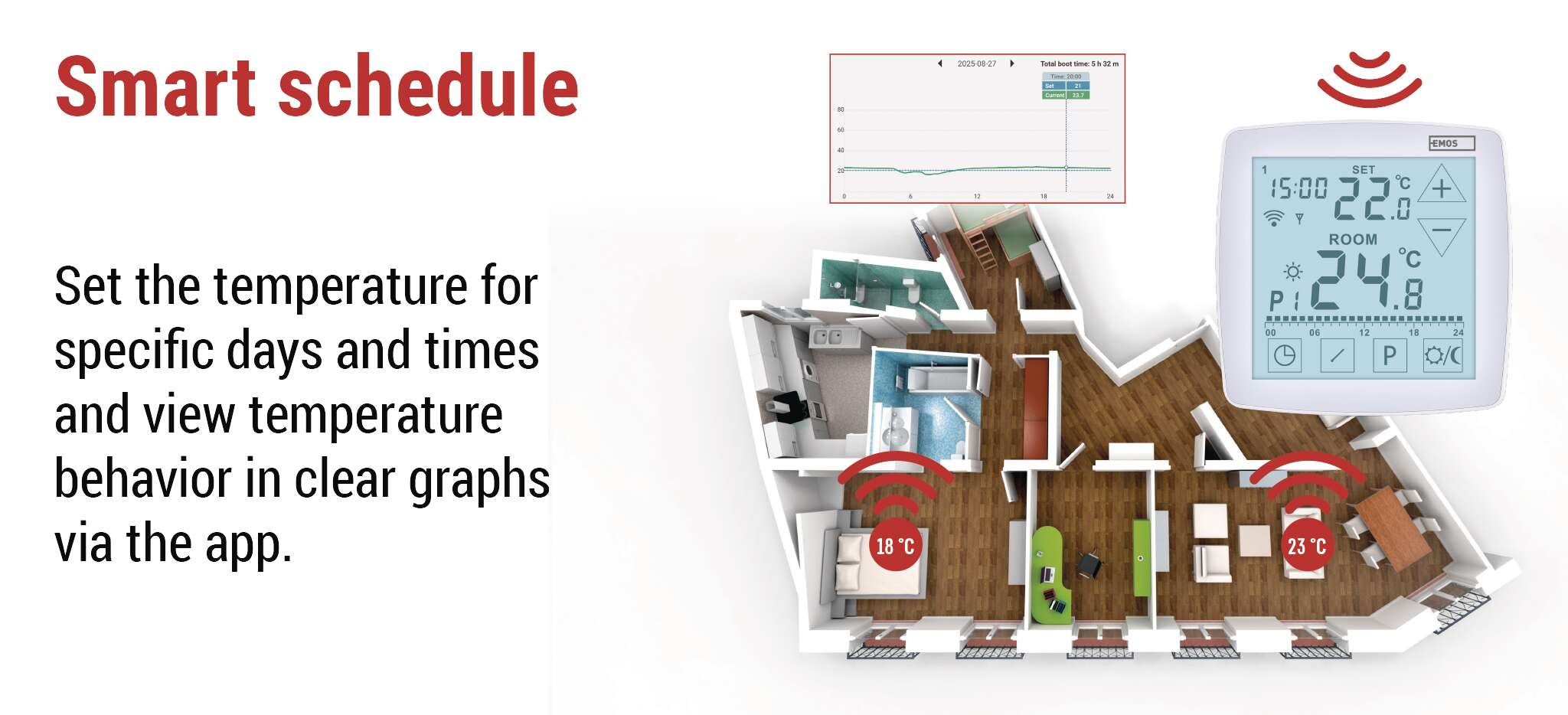 Dėka išmaniosios GPS funkcijos termostatas automatiškai įjungia šildymą arba vėsinimą, kad grįžus jus visada pasitiktų ideali temperatūra. O jei išvykstate atostogauti ir pamirštate išjungti šildymą, ne bėda - bet kada galite viską reguliuoti nuotoliniu būdu naudodamiesi mobiliąja EMOS GoSmart programėle. Patogumas, taupymas ir saugumas - kad ir kur būtumėte.