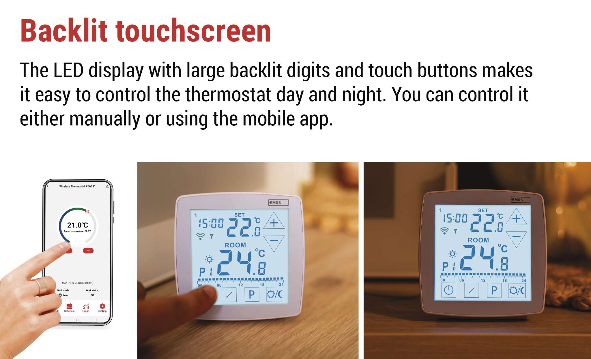 Termostatas P56S11 sujungia praktišką funkcionalumą ir modernų, laikui nepavaldų dizainą, tinkantį bet kokiam interjerui. Apšviestas jutiklinis ekranas yra aiškus ir intuityvus - dideli skaitmenys leidžia lengvai matyti esamą ir nustatytą temperatūrą, o dėl foninio apšvietimo juo patogu naudotis net naktį, neįjungus šviesos. Be to, termostatas palaiko "Amazon Alexa" ir "Google Assistant" balso asistentus, todėl galite jį valdyti balso komandomis.