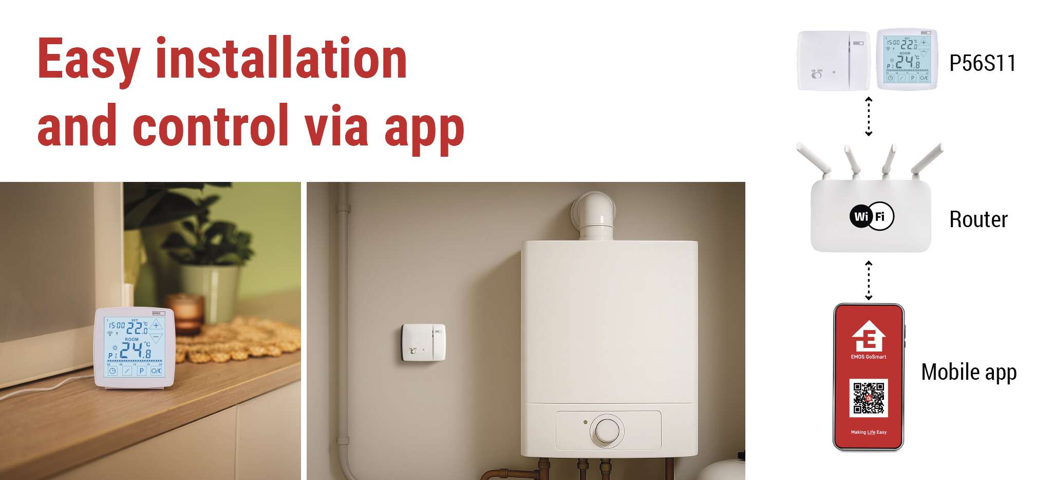 Išmanųjį termostatą P56S11 sudaro perjungiklis (imtuvas) ir siųstuvas (termostatas), kuriuos lengva suporuoti tarpusavyje pagal pridedamą instrukciją. Pasirinkite tinkamą vietą termostatui - geriausia ten, kur dažniausiai būna namų ūkio nariai. Tiesiog pritvirtinkite perjungimo įrenginį prie sienos šalia šilumos šaltinio ir prijunkite laidus pagal aiškią schemą.
