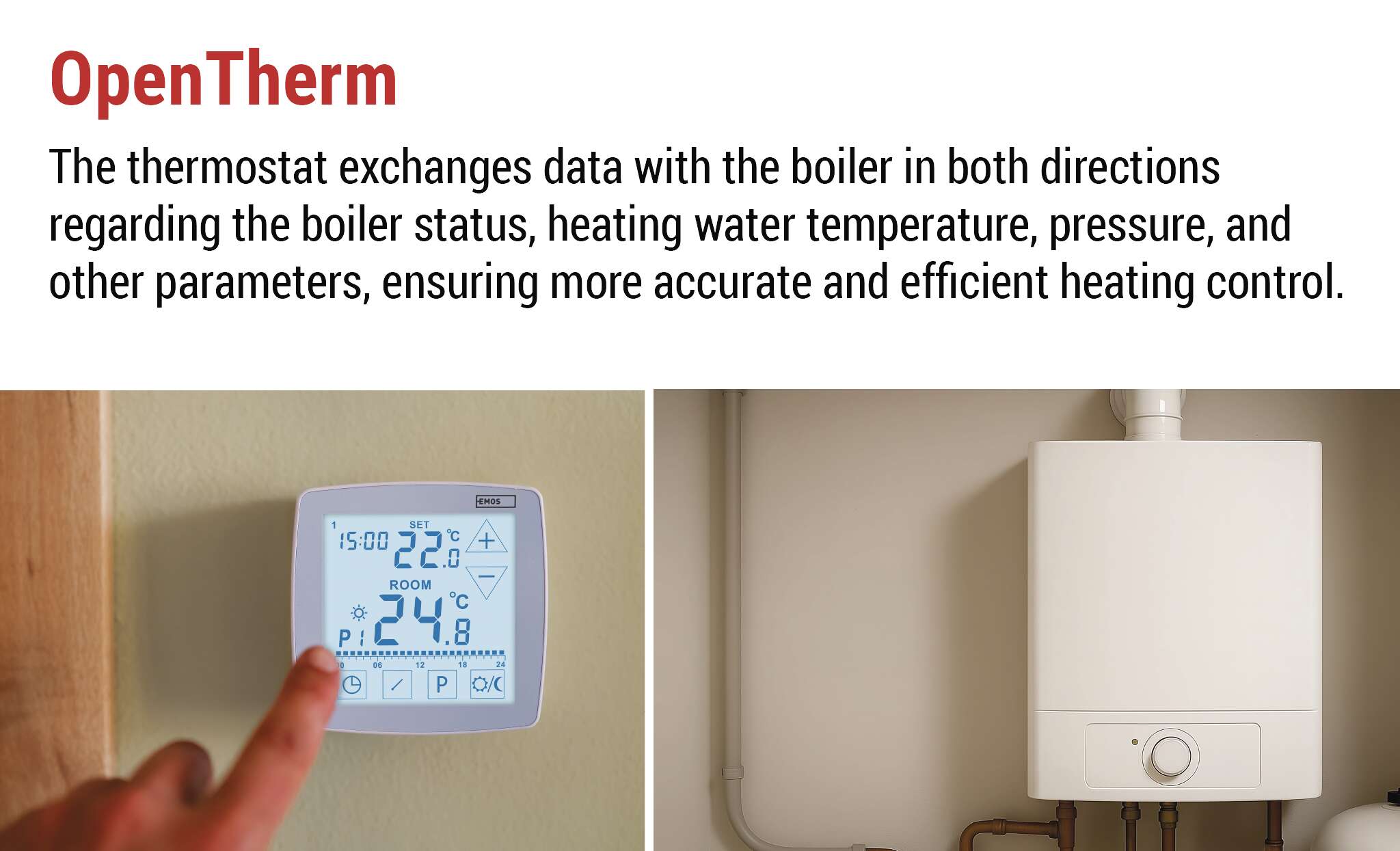 Termostatą galite prijungti prie katilo, kuris palaiko OpenTherm ryšį. perjungimas atliekamas OT ir relės būdu. Dauguma termostatų turi tik OT išėjimą arba relinį išėjimą. P56A01 termostatas turi abi išvestis, kad būtų galima prisijungti prie katilo.