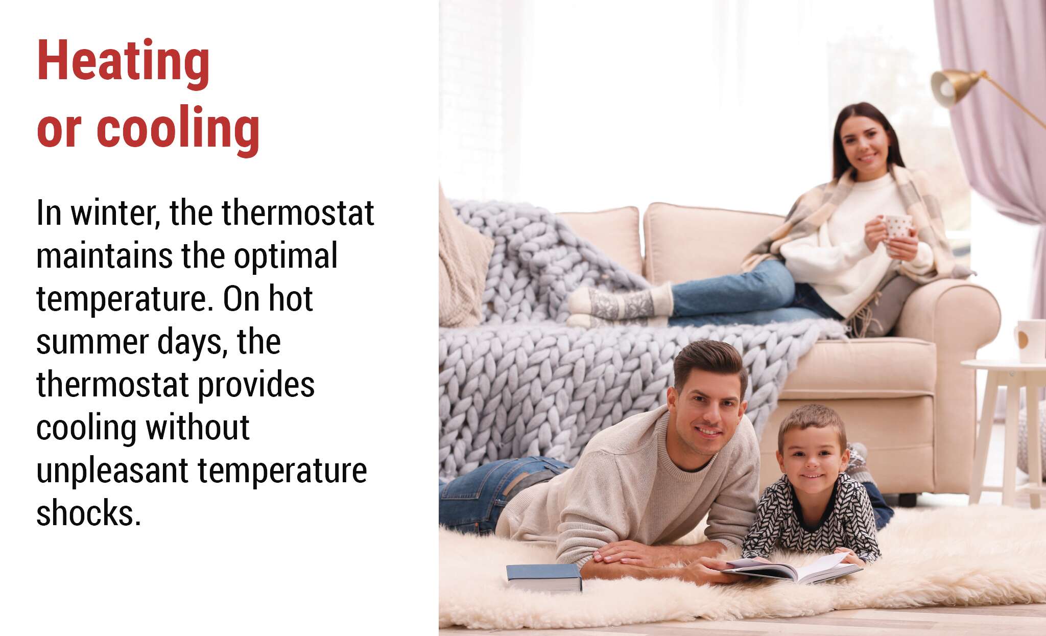 Suteikite savo namams idealią temperatūrą visais metų laikais. Laidinis kambario termostatas su "OpenTherm" ryšio palaikymu automatiškai palaiko šilumą žiemą ir vėsą vasarą - taip, kaip jums patinka. Su 6 iš anksto nustatytomis ir 3 naudotojo reguliuojamomis programomis lengva suplanuoti šildymą ir vėsinimą pagal savo dienos ritmą. Termostatas patikimai valdo šildymo sistemą ir oro kondicionavimo sistemą ir užtikrina stabilią temperatūrą nuo 7 °C iki 30 °C - dieną ir naktį. Aiškiame, apšviestame ekrane su dideliais skaitmenimis visada aiškiai matysite esamą ir pageidaujamą temperatūrą.