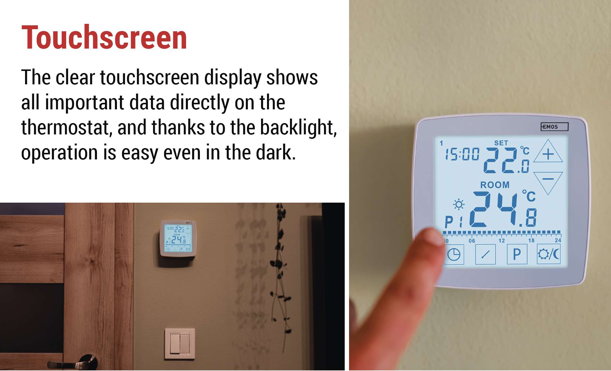 Termostatas P56A02 sujungia praktinį funkcionalumą ir šiuolaikišką, nesenstantį dizainą, tinkantį bet kokiam interjerui. Jutiklinis ekranas su apšvietimu yra aiškus ir intuityvus - dideli skaitmenys leidžia lengvai matyti esamą ir nustatytą temperatūrą, o dėl foninio apšvietimo juo patogu naudotis net naktį, neįjungus šviesos.