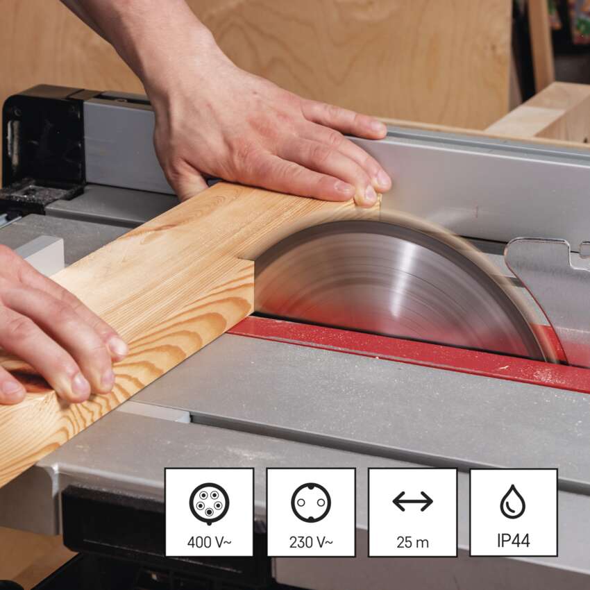 Dirbdami įvertinsite galimybę prijungti prietaisus, kuriems reikia trijų fazių, esant 400 V AC apkrovai suvyniotas kabelis: 6,25 A maks./Be to, prie dviejų lizdų, kuriuos taip pat turi ilgintuvas, galima prisijungti dar du 230 V įtampos prietaisus.