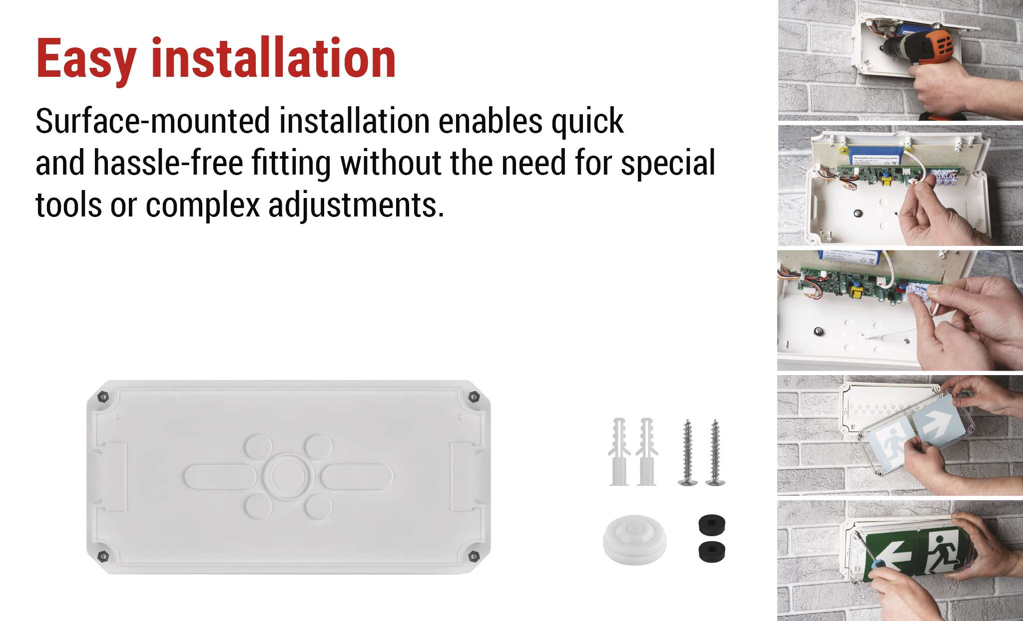 NESSI avarinis žibintas tiesiog įstatomas už difuzoriaus, jo nereikia klijuoti. Šis sprendimas leidžia greitai įrengti ir pakeisti kryptinius žymeklius, taupo laiką juos montuojant ir atliekant techninę priežiūrą bei išlaiko elegantišką šviestuvo išvaizdą.