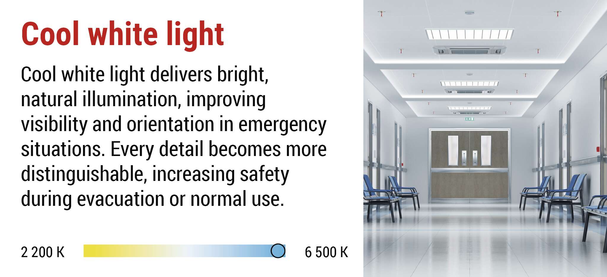 Dėl šaltos baltos spalvos žibinto užtikrinamas ryškus ir kontrastingas apšvietimas, kuris užtikrina saugią orientaciją ir maksimalų matomumą evakuacijos keliuose ir lauke.