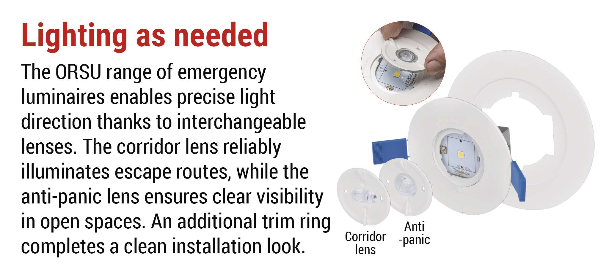 Lęšiai leidžia pritaikyti apšvietimą prie konkrečių erdvės poreikių. Koridoriaus lęšiai naudojami siauruose koridoriuose ir praėjimuose, pavyzdžiui, biuruose, mokyklose ar viešbučiuose, kur nukreipia šviesą išilgai kelio ir užtikrina tolygų ir aiškų evakuacijos kelio žymėjimą. Antipanikos lęšis skirtas atviroms erdvėms, pavyzdžiui, vestibiuliams, fojė ar viešosioms patalpoms, o jo plati šviesos sklaida leidžia saugiai orientuotis ir judėti, net kai erdvėje vienu metu yra daug žmonių. Taigi abu lęšiai užtikrina patikimą ir saugų apšvietimą tiksliai pagal erdvės pobūdį ir poreikius.