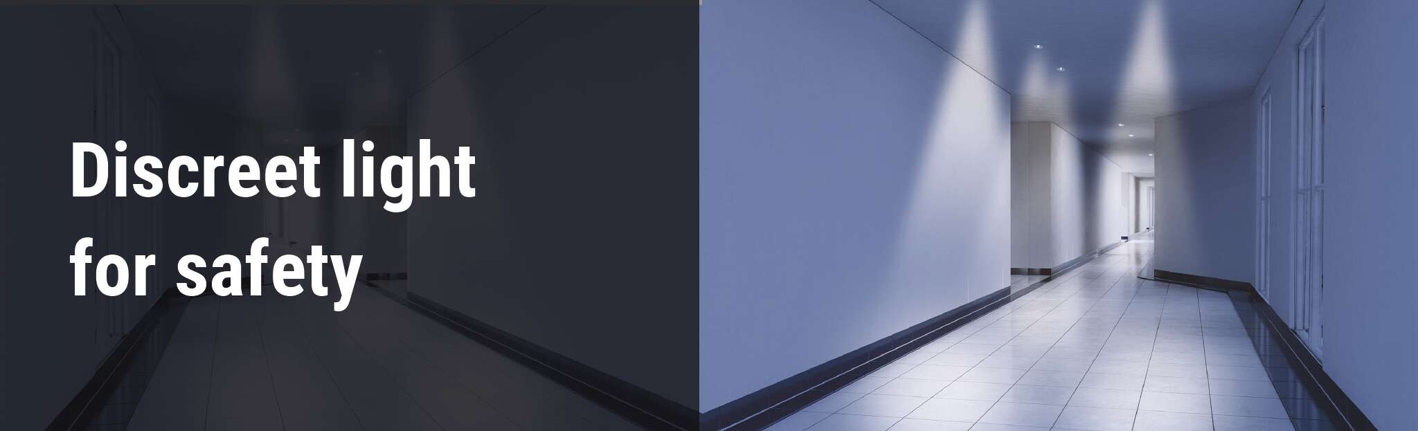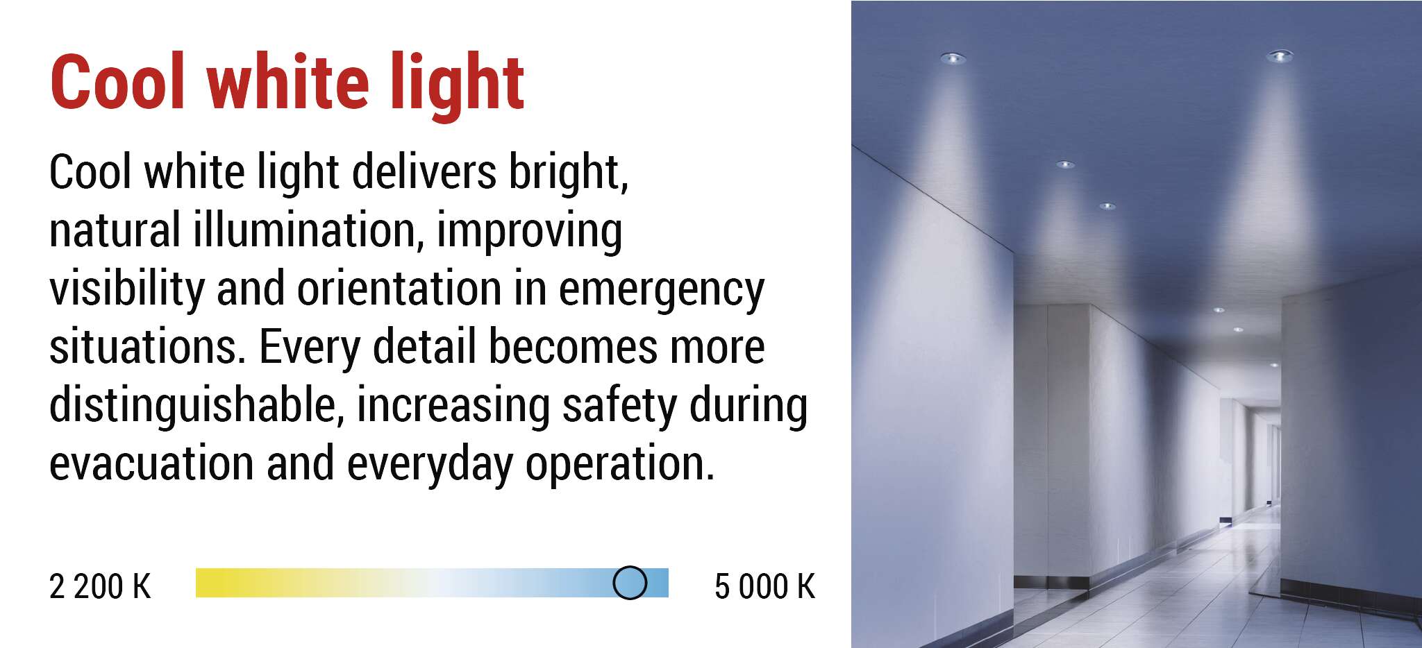 Dėl šaltos baltos spalvos šviesos avarinis apšvietimas aiškiai žymi evakuacijos kelius ir leidžia saugiai judėti bei orientuotis net dingus elektrai.