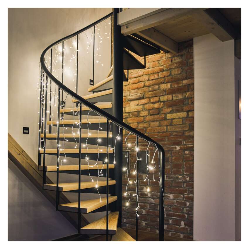 Kalėdinės grandinės CLASSIC - daugiafunkciniai stalaktitai (ledukai) yra vienas iš "dvimačių" apšvietimo sprendimų. Šioje apšvietimo formoje kiekviena kabanti grandinėlė su LED lemputėmis yra skirtingo ilgio ir sukuria natūralaus stalaktito įspūdį. Grandinėlės leidžia pasirinkti vieną iš aštuonių iš anksto nustatytų šviesos režimų, kurie apšviečia bet kokią erdvę ir patinka tiek vaikams, tiek suaugusiesiems. pagrindiniu režimu visos lemputės šviečia nuolat, o likusieji septyni režimai - tai įvairių mirksėjimo, išjungimo ir įjungimo režimų derinys. Galite papuošti laiptus, turėklus, pakabinti žibintus languose arba pakabinti juos ant balkonų. Taip pat galite išbandyti ne tokį tradicinį panaudojimą ir uždėti juos ant vartų, tvoros ar vartelių. Žibintai išsiskirs ant jūsų namo frontono.Dėl galimybės nustatyti skirtingus apšvietimo režimus jie patiks ir tiems, kurie reikia subtilios ir statiškos šviesos dekoracijos, ir tiems, kurie ieško dinamiškos šviesos dekoracijos.