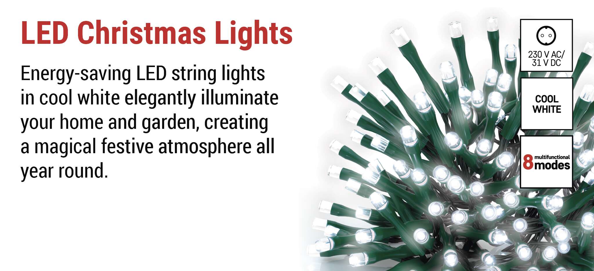 Dėl IP44 klasės ši grandinė tinka naudoti lauke ir viduje. Ji atspari drėgmei, žemai temperatūrai ir nedideliems nešvarumams, todėl ją galite naudoti tiek ant eglutės svetainėje, tiek ant pavėsinės, balkono ar lauko turėklų. Maitinimas iš 31 V nuolatinės srovės adapterio užtikrina mažiausią saugumą net ir ilgai veikiant.