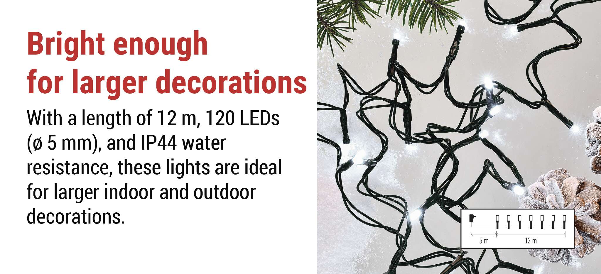 S 5 m ilgio maitinimo kabeliu patogiai pasieksite kiekvieną kištukinį lizdą, o viso 12 m ilgio apšvietimo ilgis su 10 cm atstumais tarp šviesos diodų leidžia tolygiai paskirstyti šviesą. Tiesiog prijunkite, pasirinkite režimą ir tiesiog leiskite šviesti šventinei nuotaikai.