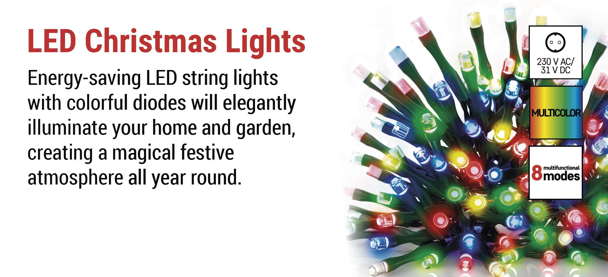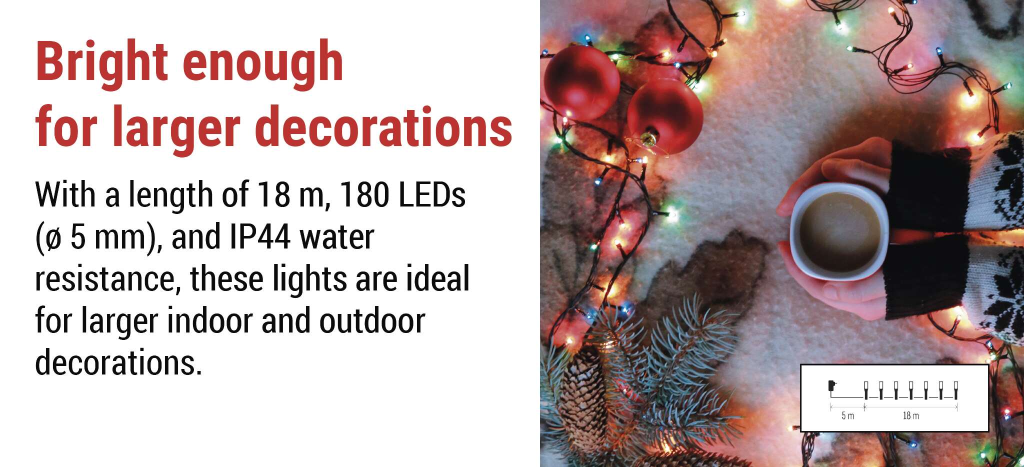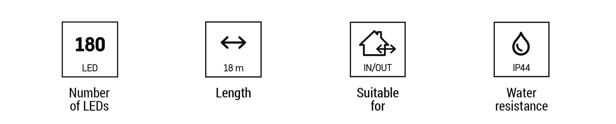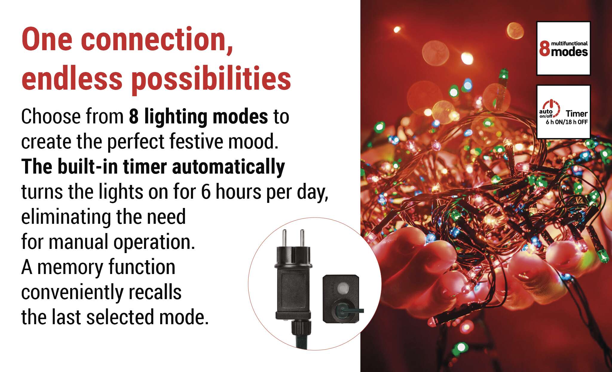 S 5 m ilgio maitinimo laidu patogiai pasieksite kiekvieną kištukinį lizdą, o iš viso 18 m ilgio su 10 cm atstumais tarp šviesos diodų užtikrinsite tolygų šviesos paskirstymą. Tiesiog įjunkite, pasirinkite režimą ir leiskite šviesti šventinei nuotaikai.