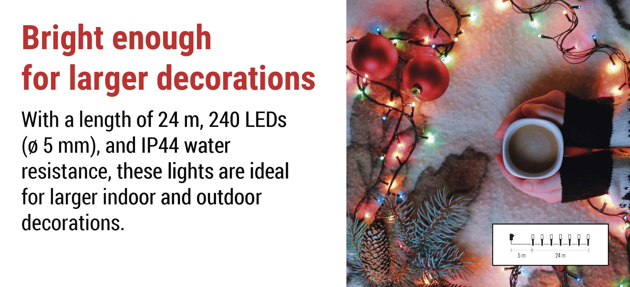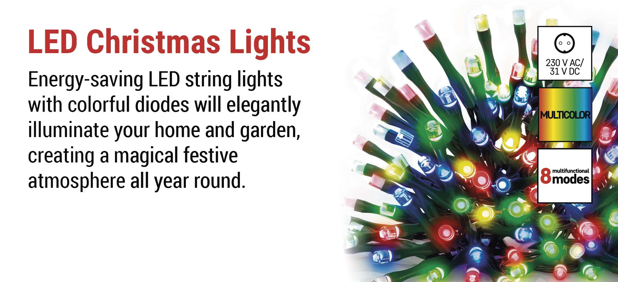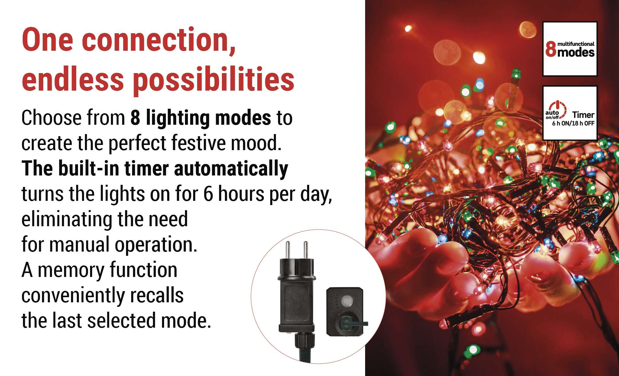 S 5 m ilgio maitinimo laidu patogiai pasieksite kiekvieną kištukinį lizdą, o viso 24 m ilgio apšvietimo laidas su 10 cm atstumais tarp šviesos diodų leidžia tolygiai paskirstyti šviesą. Tiesiog įjunkite, pasirinkite režimą ir leiskite šviesti šventinei nuotaikai.