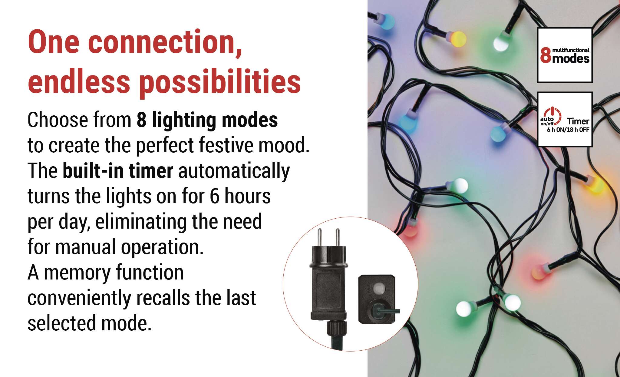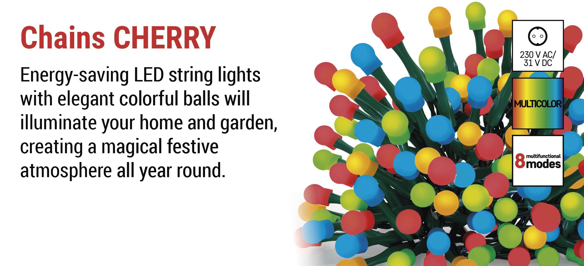 LED kalėdinė girlianda Cherry–rutul.,8 m,lauko ir vidaus,įvairiaspalvė,8 režimai,laikm.