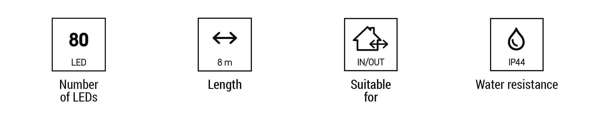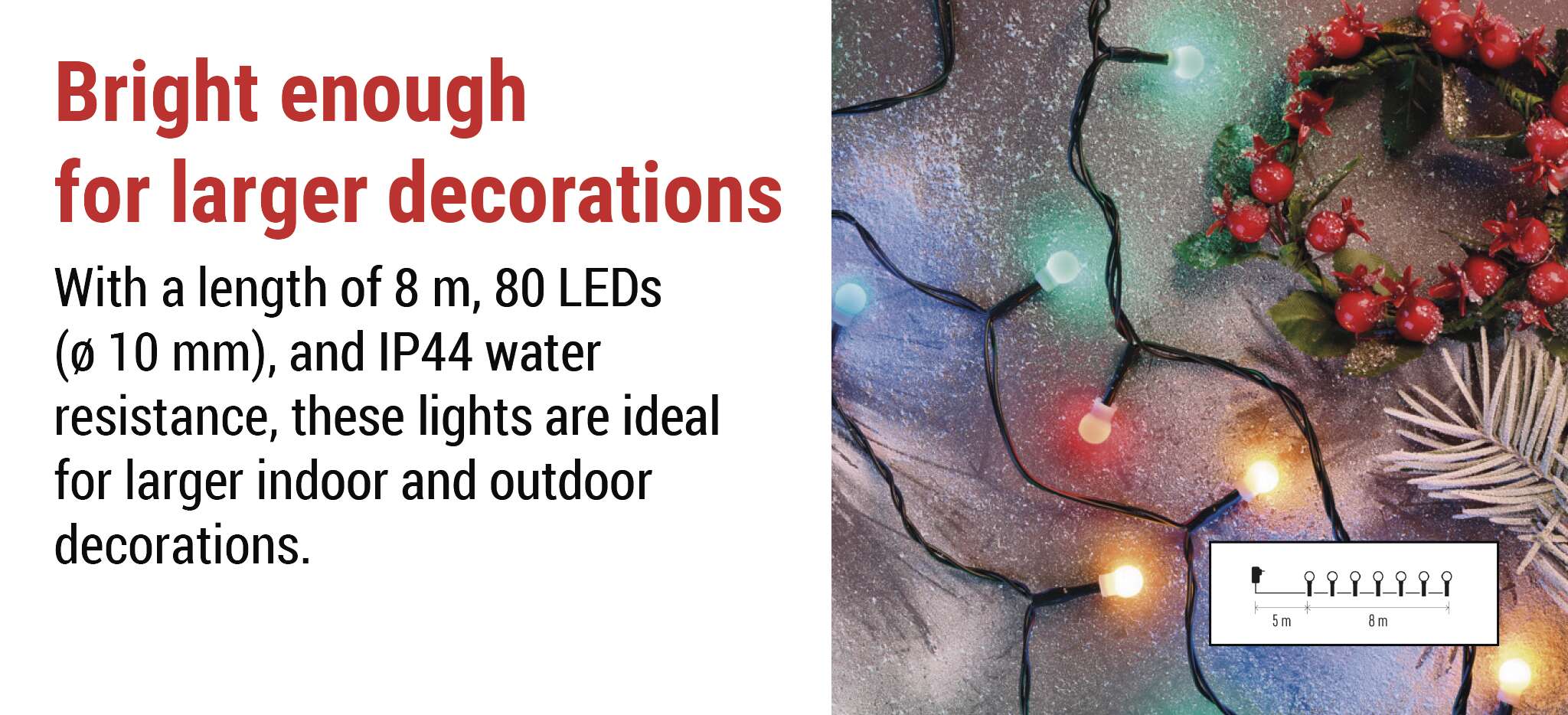 S 8 metrų ilgio ir 80 šviesos diodų galite lengvai papuošti ne tik mažesnes dekoracijas patalpose, bet ir didesnes eglutes ar terasos turėklus. Dėl IP44 atsparumo klasei nereikės nerimauti dėl naudojimo lauke - jis atlaikys lietų ir sniegą. Jis taip pat puikiai tinka šventinei atmosferai sukurti šeimos susitikime, vestuvėse ar sodo vakarėlyje.