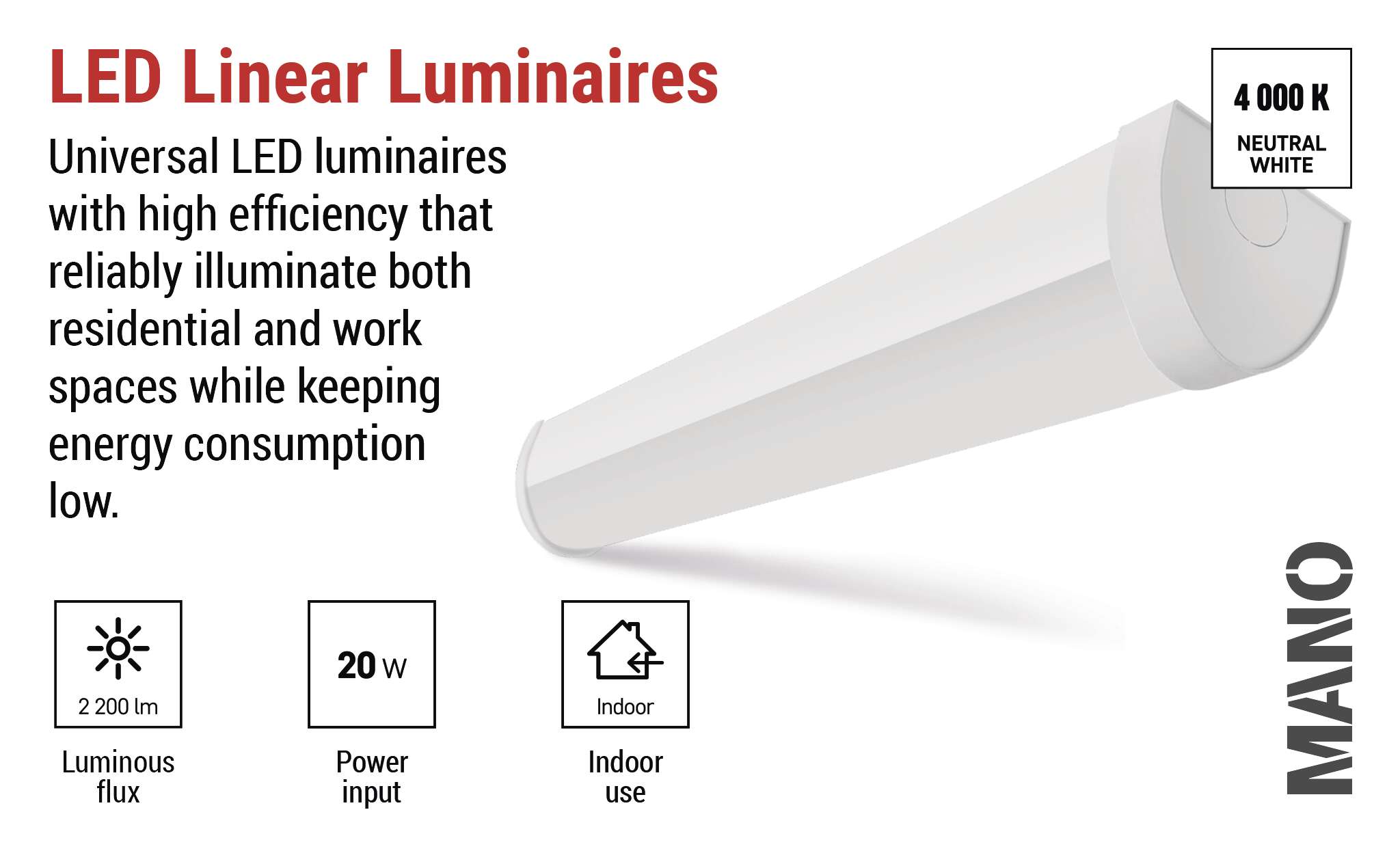 LED lineārais gaismeklis MANO 20W, neitrāli balts