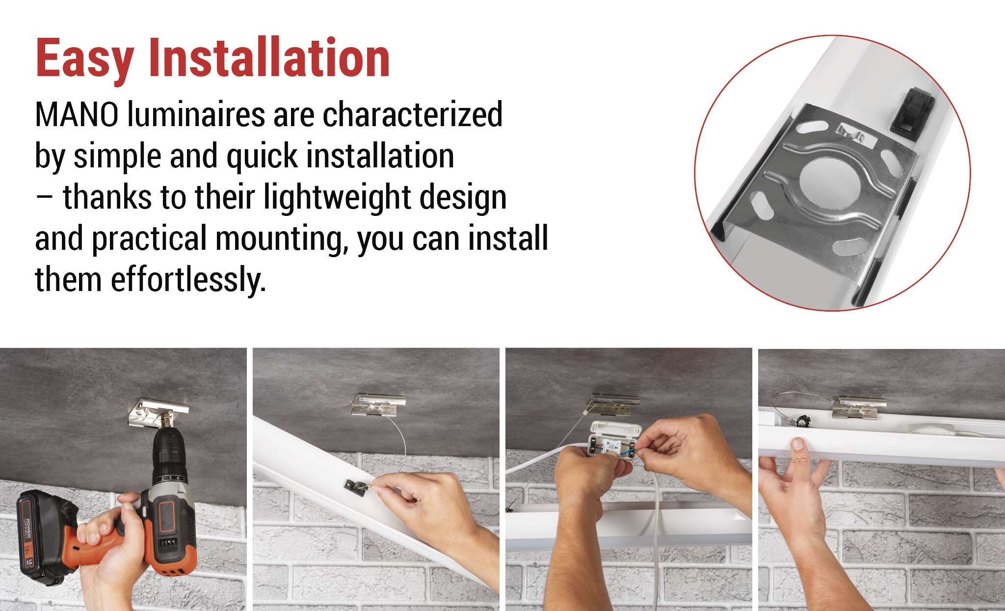 Dėl sudėtingos konstrukcijos MANO šviestuvai montuojami greitai ir be rūpesčių. Tiesiog pritvirtinkite šviestuvą prie lubų ar sienos ir iškart turėsite patikimą apšvietimą be sudėtingų laidų ar specialių įrankių.
