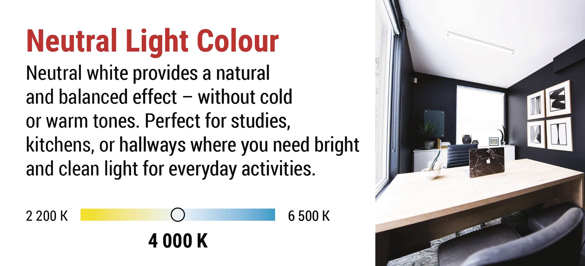 "MANO" šviestuvai šviečia malonia neutralia balta šviesa, kuri tiksliai perteikia spalvas ir neiškraipo aplinkos. Šis atspalvis idealiai tinka darbo ir gyvenamosioms patalpoms - atrodo natūraliai, nevargina akių ir sukuria malonią atmosferą visą dieną. Dėl tolygaus šviesos pasiskirstymo jis užtikrina ryškų apšvietimą be šešėlių. Neutrali balta spalva taip pat puikiai dera moderniame interjere, kur pabrėžia švarią ir elegantišką erdvės išvaizdą.