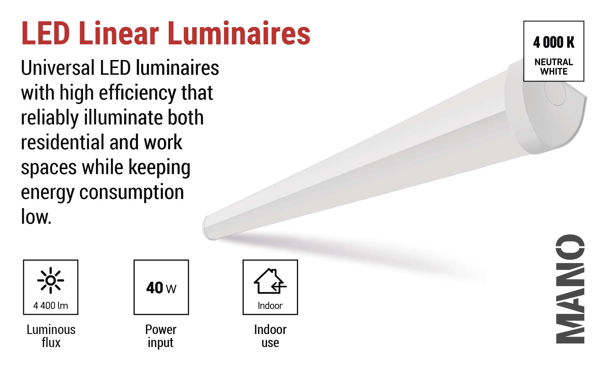 MANO siūlo malonų ir tolygų apšvietimą, kuris pagerina kasdienio darbo ir kasdienės veiklos komfortą. Jo paprastas ir santūrus dizainas puikiai dera prie įvairių tipų interjerų, kartu užtikrindamas patikimą ir ilgalaikį funkcionalumą. MANO - tai šviestuvas, kuriuo galite pasikliauti, nes jis sujungia kokybę, praktiškumą ir modernią išvaizdą.
