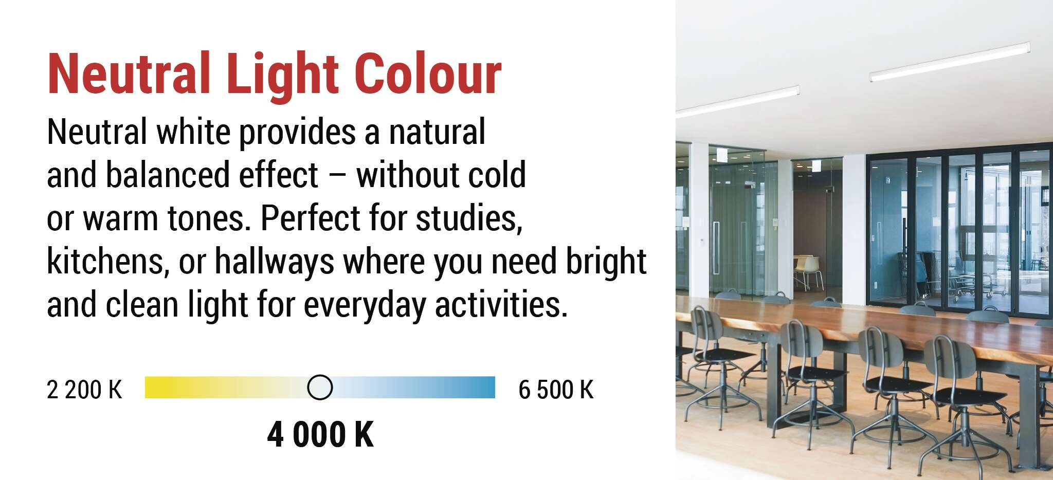 "MANO" šviestuvai šviečia malonia neutralia balta šviesa, kuri tiksliai perteikia spalvas ir neiškraipo aplinkos. Šis atspalvis idealiai tinka darbo ir gyvenamosioms patalpoms - atrodo natūraliai, nevargina akių ir sukuria malonią atmosferą visą dieną. Dėl tolygaus šviesos pasiskirstymo jis užtikrina ryškų apšvietimą be šešėlių. Neutrali balta spalva taip pat puikiai dera moderniame interjere, kur pabrėžia švarią ir elegantišką erdvės išvaizdą.