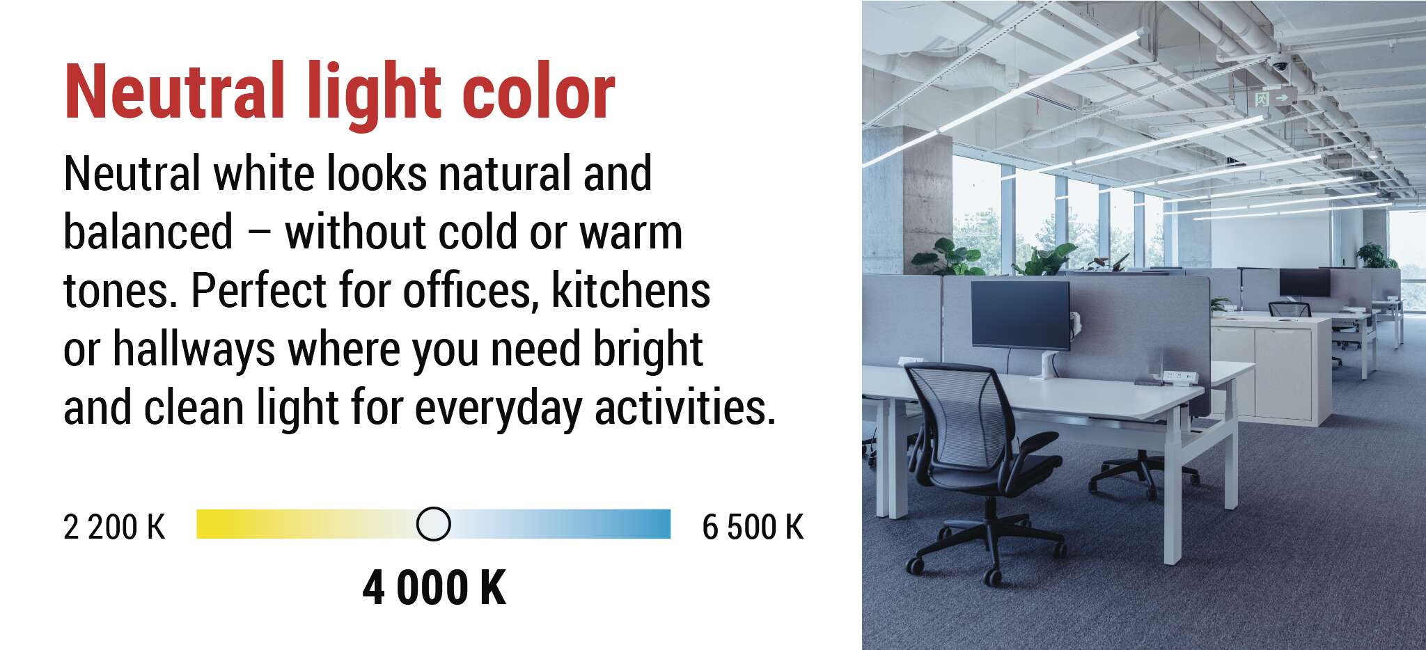 Dėl neutralios baltos spalvos šviesos lengvai pastebimos detalės, o spalvos išlieka tikros. Tai palengvina kasdienę veiklą ir sumažina akių nuovargį ilgai būnant patalpoje. LED technologija taip pat užtikrina tolygų šviesos paskirstymą be mirgėjimo ar nepageidaujamų šešėlių, todėl gaunamas efektas yra malonus ir patogus kiekvienam naudotojui.