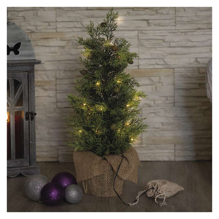 Papuoškite savo namus ar sodą stilinga kalėdine eglute su šiltu LED apšvietimu, kuri suteikia natūralią išvaizdą ir jaukią šventinę atmosferą. Dėl realistinio pagaminimo ir elegantiško džiuto apvyniojimo ant vazono ji yra graži puošmena. Baterijų skyrius paslėptas džiuto maišelyje - netrukdo jokie laidai ar lizdai.