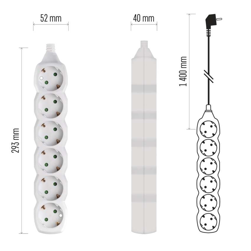 Prailginimo laidas 1,4 m / 6 lizdai / baltas / PVC / 1 mm2