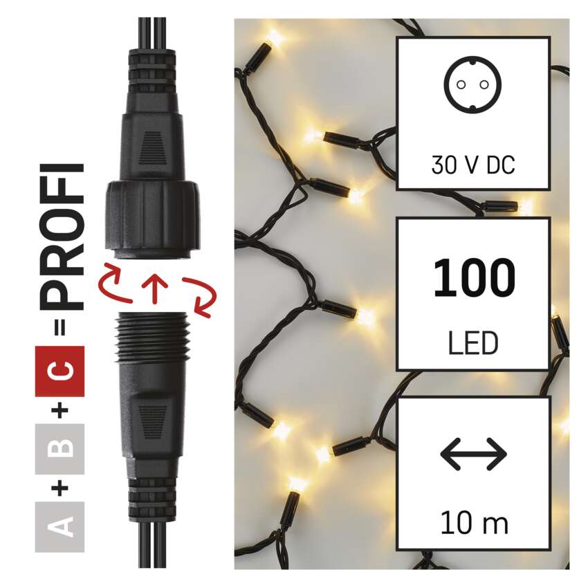 Prijungimo sistema CONNECT SYSTEM PROFI dėl IP44 klasės tinka naudoti tiek patalpose, tiek lauke. Jis pasižymi padidintu medžiagų atsparumu ir papildyta 3 metų garantija. Aukštos kokybės guminius kabelius galima montuoti ištisus metus, neišardant jų bet kokiomis temperatūros sąlygomis. Galite rinktis standartines grandines, žingsninius ir klasterius. Iš vieno maitinimo šaltinio(A), prijungto prie prailginimo kabelių, skirstytuvų(B) ir LED šviesos elementai(C) gali maitinti iki 500 LED lempučių.