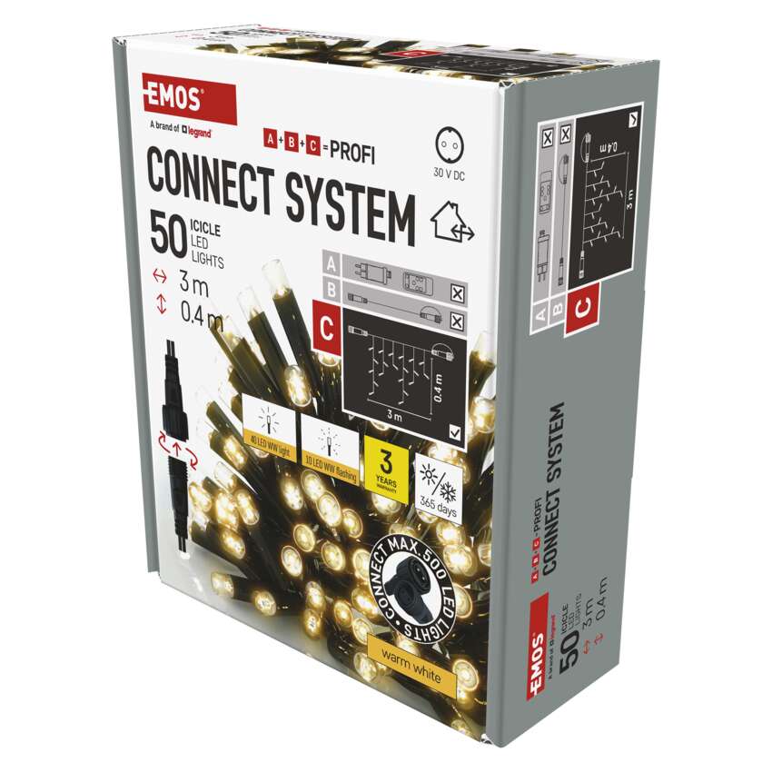 "CONNECT SYSTEM PROFI LED stalaktitai (ledai) yra 3 m ilgio ir 0,4 m aukščio. Jei ieškote spalvos, geriausiai derančios prie namo eksterjero ar interjero, galite rinktis iš šiltos baltos, šaltos baltos arba spalvų derinių su keliomis LED lemputėmis vienoje grandinėlėje.