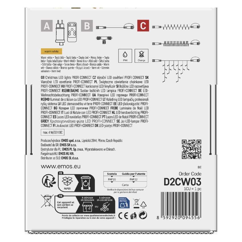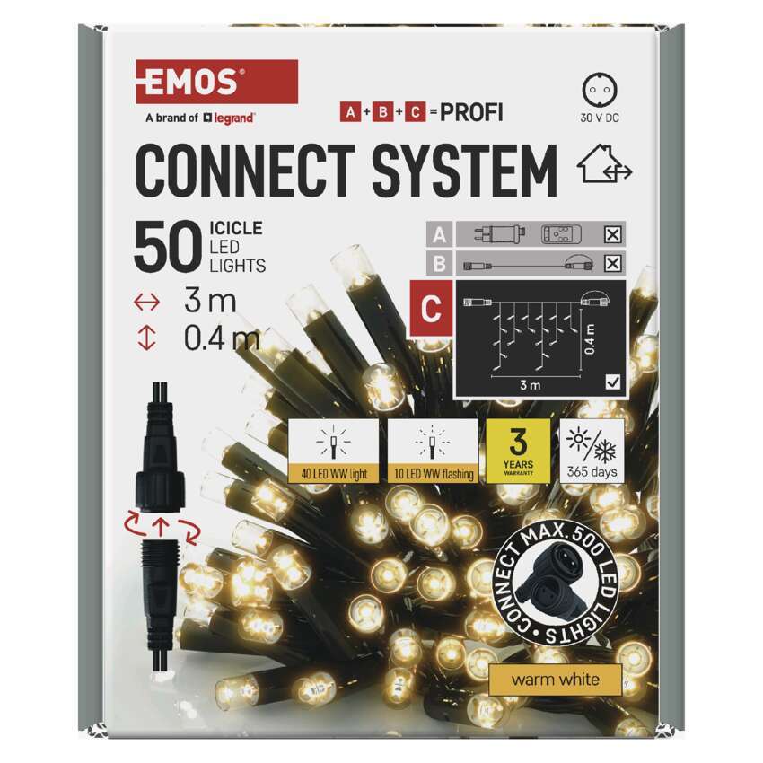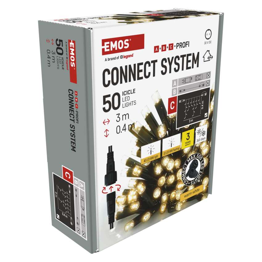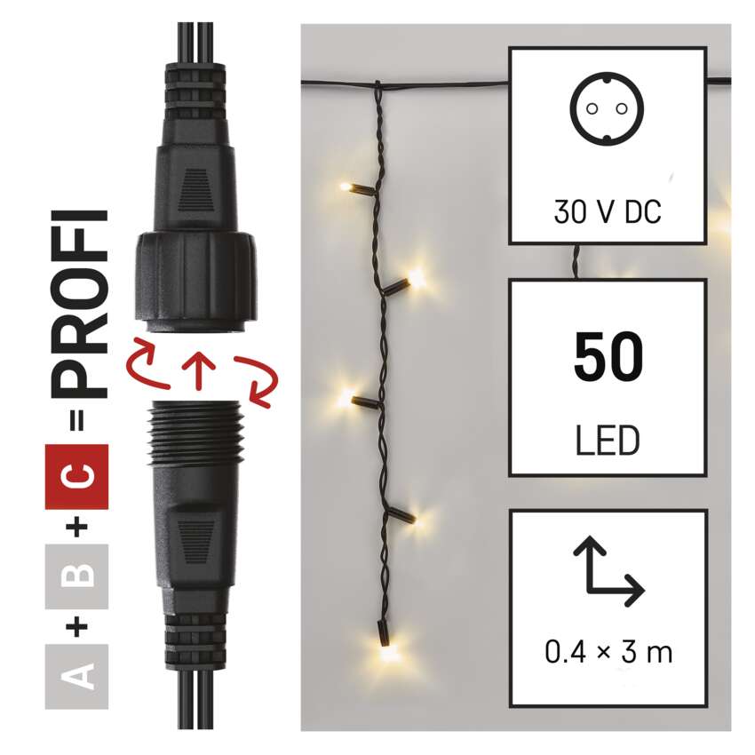 Prijungimo sistema CONNECT SYSTEM PROFI tinka naudoti tiek patalpose, tiek lauke, nes atitinka IP44 klasę. Jis pasižymi didesniu medžiagų atsparumu ir papildyta 3 metų garantija. Aukštos kokybės guminius kabelius galima montuoti ištisus metus, neišardant jų bet kokiomis temperatūros sąlygomis. Galite rinktis iš standartinių grandinėlių, stalaktitų ir klasterių. Iš vieno maitinimo šaltinio(A), prijungto prie prailginimo kabelių, skirstytuvų(B) ir LED šviesos elementai(C) gali maitinti iki 500 LED lempučių.