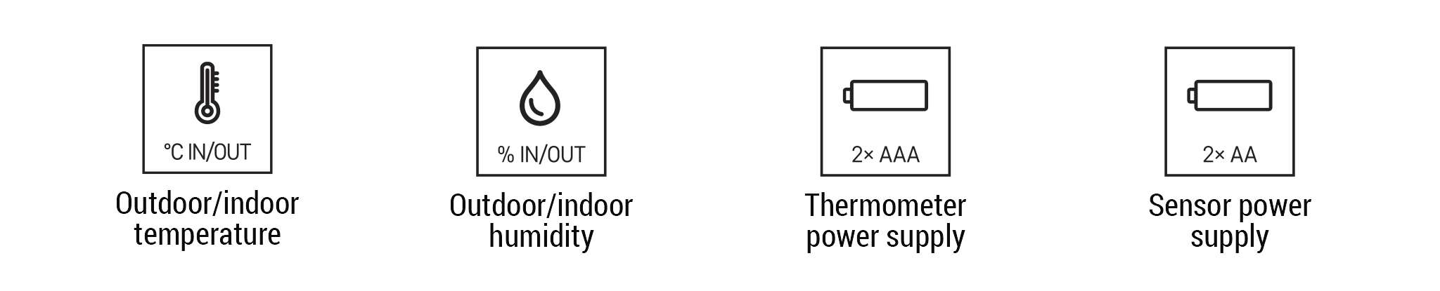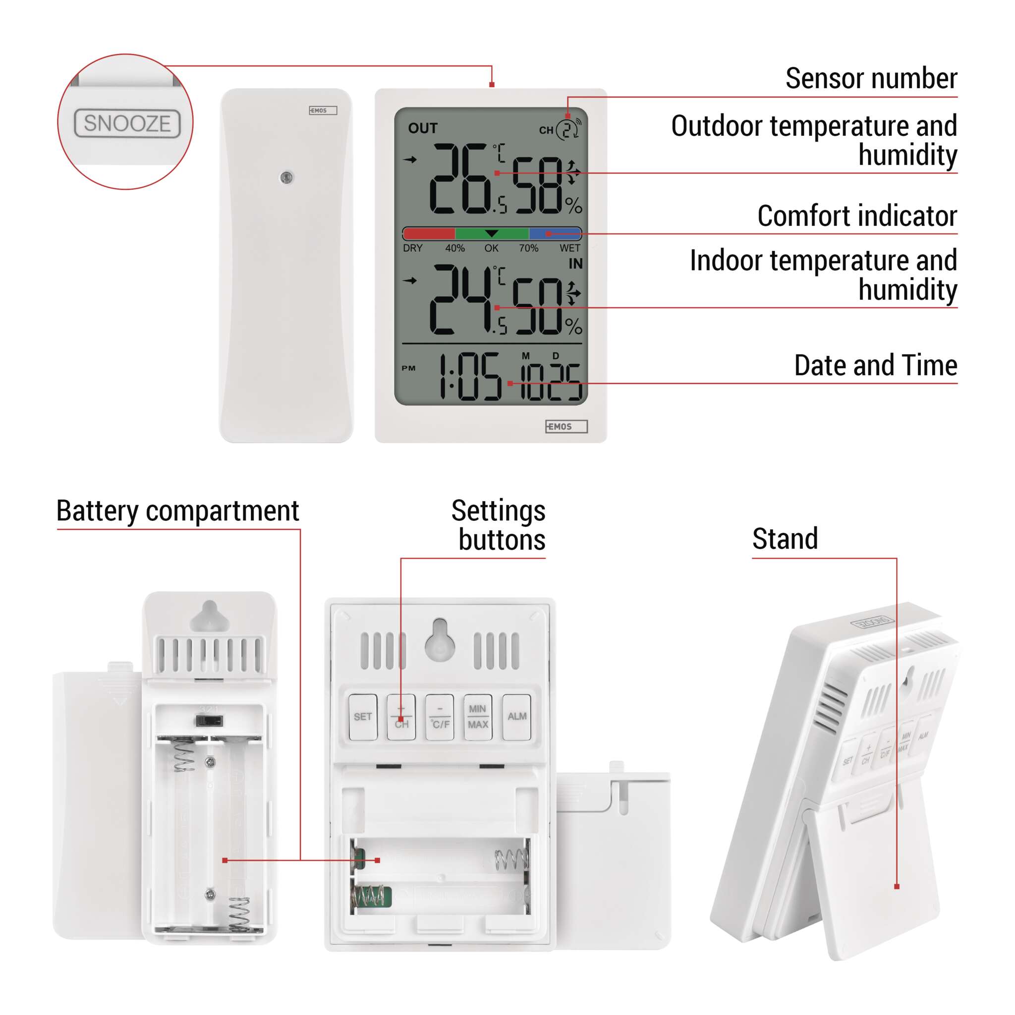 Šis modernus belaidis termometras lengvai rodo vidaus ir lauko temperatūrą 0,1 °C skiriamąja geba, rodo vidaus ir lauko drėgmę nuo 1 % iki 99 % RH ir siūlo temperatūros tendenciją arba trijų lygių komforto indikatorių. Lauko temperatūrą matuoti padeda belaidis jutiklis, kurį galima pastatyti iki 100 m atstumu nuo termometro atviroje erdvėje.