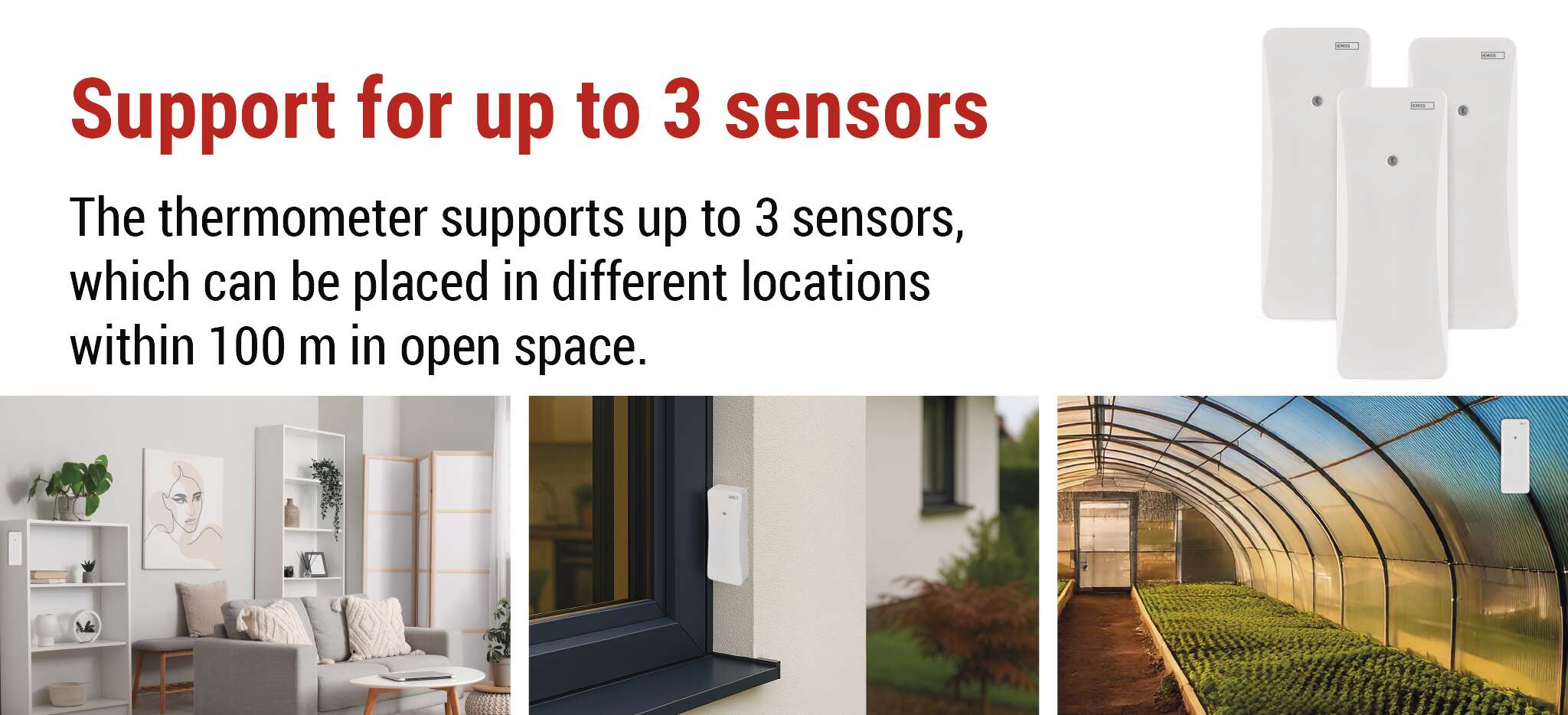 Dėl jutiklio aprėpties iki 100 metrų atstumo galite lengvai pastatyti jį bet kur, pavyzdžiui, nutolusiose patalpose ar sode. Be to, prie termometro galite prisijungti iki 3 jutiklių, todėl galėsite stebėti temperatūrą lauke ir skirtingose namo vietose, pavyzdžiui, garaže, rūsyje ar rūsyje. Atskirą jutiklį rinkiniui praplėsti galite rasti mūsų el. parduotuvėje E00387.